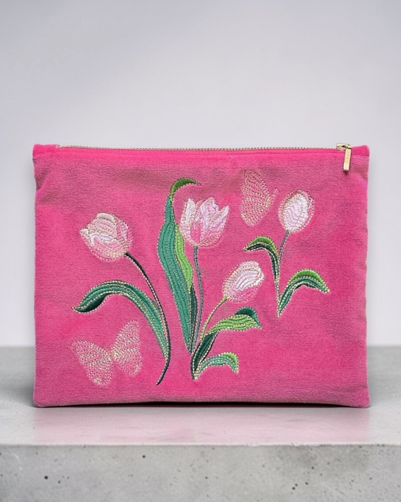 Autorski haft z kolekcji Wiosna - w tym przypadku tulipany, wykonany wysokogatunkowymi nićmi, detale podkreślone nićmi metalizowanymi.